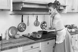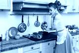 Colorful retro / pin up girl woman female / housewife wearing colorful top, skirt and white apron holding ladle and cooking soup in the kitchen with blue cabinets and utensils. Housework concept