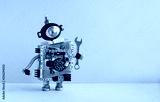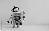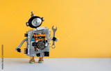 Hand wrench robot serviceman on yellow background. Cyborg toy with lamp bulb head, futuristic silver body. Copy space