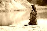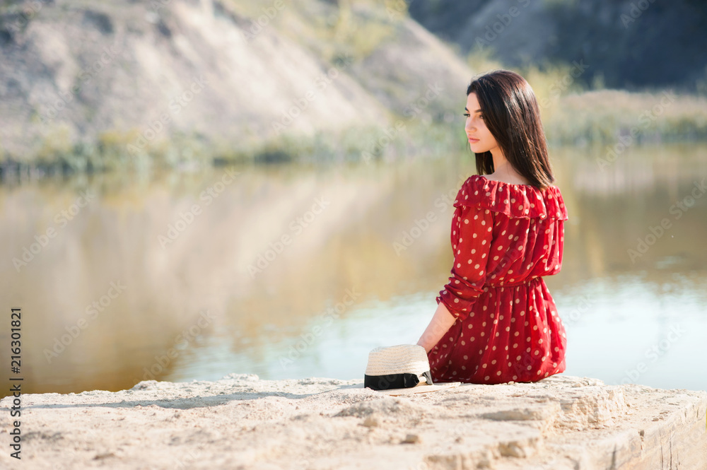 A young brunette sits is back in expectation on a sandy beach in a red dress and hat