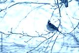 Closeup of one vibrant saturated red northern cardinal, Cardinalis, bird sitting perched on tree branch during heavy winter snow colorful in Virginia, snow flakes falling eating flower buds