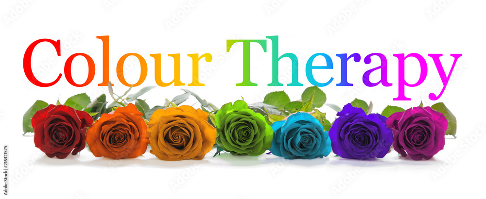 Colour Healing Therapy Banner - A row of seven rose heads in red, orange, yellow, green, turquoise, indigo and magenta with a graduated rainbow coloured Colour Healing phrase positioned above