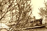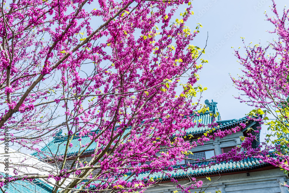 Pink flowers on cercis chinensis or chinese eastern redbud tree against blue sky and pagoda architecture