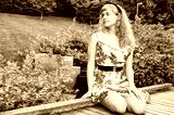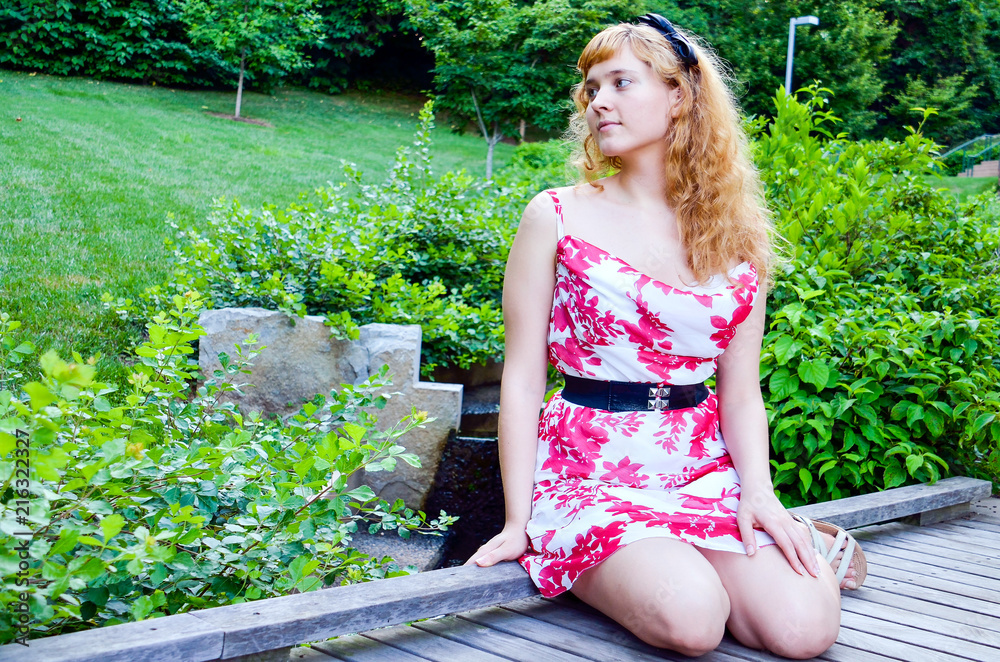 Young blonde woman girl sitting on path by creek fountain in summer with red dress