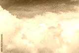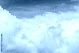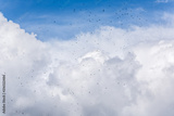 Many white seagulls birds flying high in flock group against isolated stormy gray blue large big huge cloud in storm sky