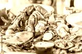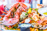 Macro closeup of whole lobsters in shell and seafood platter on plate with tartar sauce, garlic butter, shrimp tempura, crab meat, lemon, drinks, food