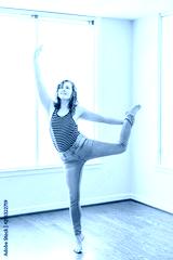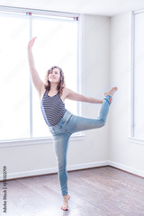 Young happy woman stretching dancing in empty modern new room with hardwood floors and large sunny windows in apartment
