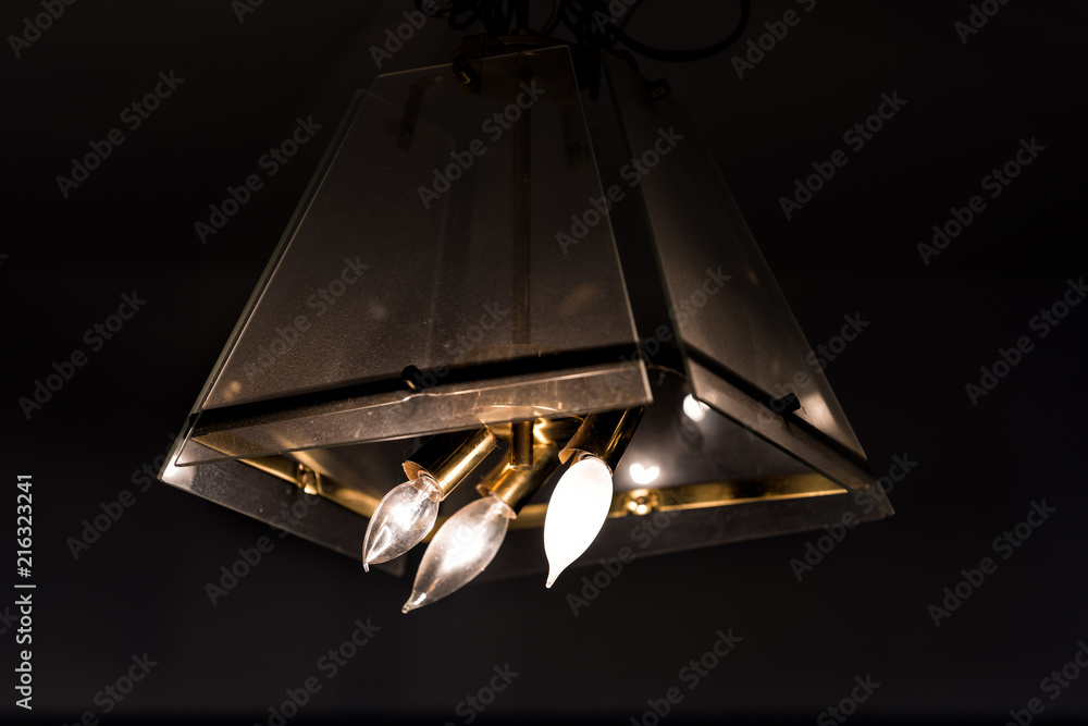 Closeup of old-fashioned light lit modern fixture lamp hanging from ceiling in kitchen, living or dining room with bulbs in dark room