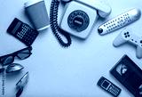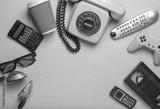 Retro objects on blue background. Rotary telephone, audio cassette, video cassette, gamepad,calculator, tv remote, headphones, push-button phone. Analog media technology of past. Copy space..