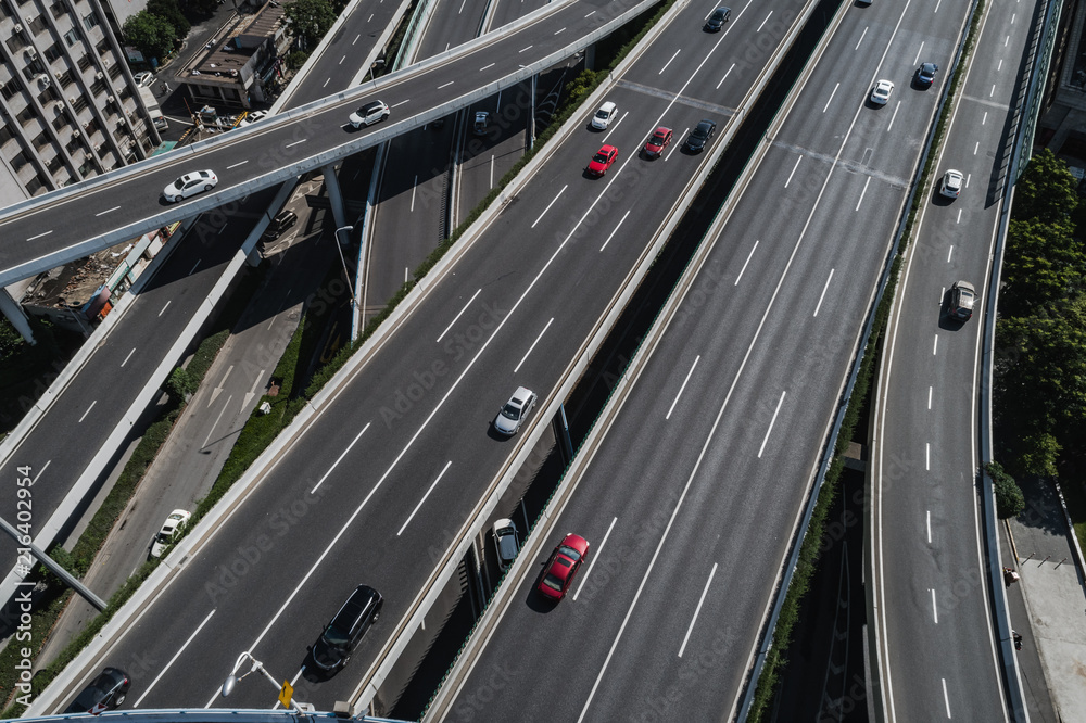 Aerial view of highway and overpass in city on sunny day