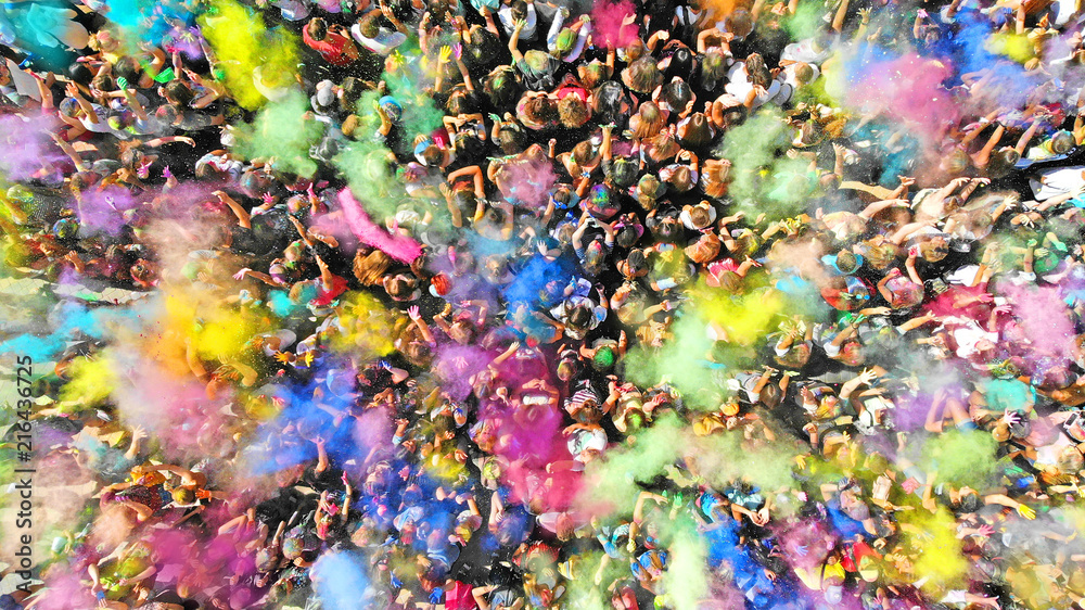 Aerial top view of a Holi Colors Festival. Splash of paint in a crowd of people view above.