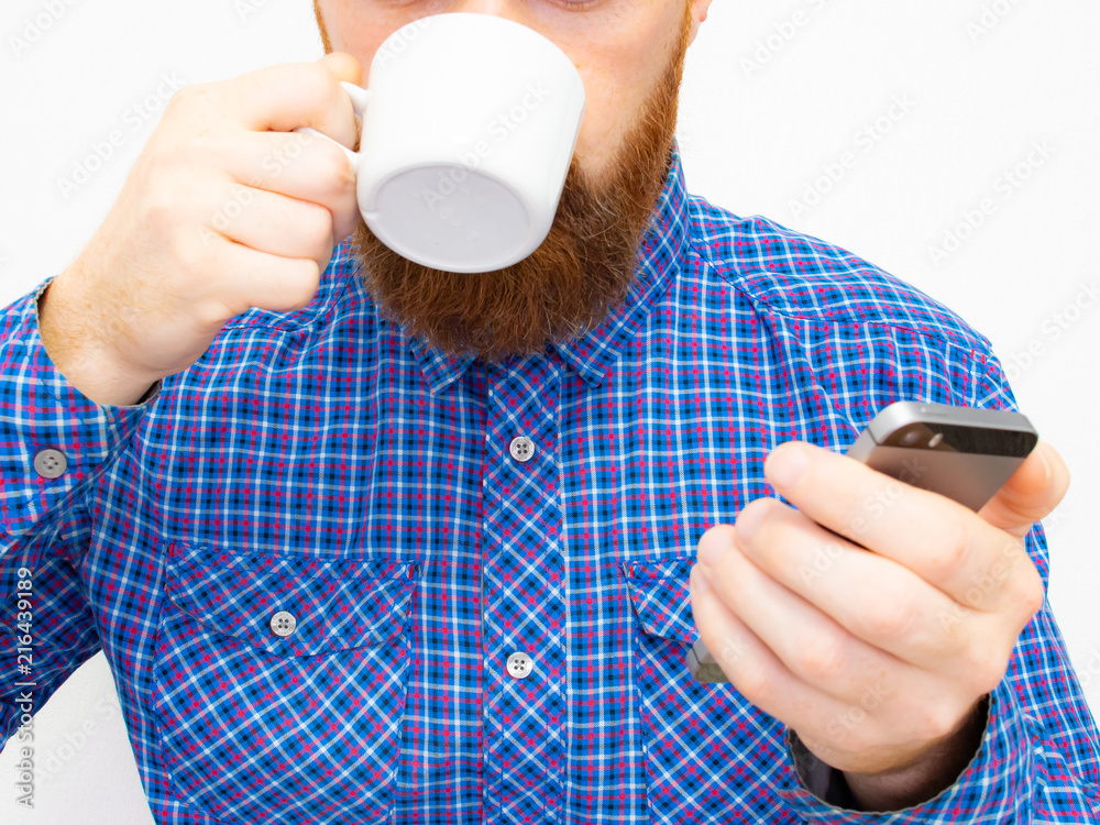 bearded man is drinking coffee and looking at the mobile phone. a man in a blue shirt. Red beard