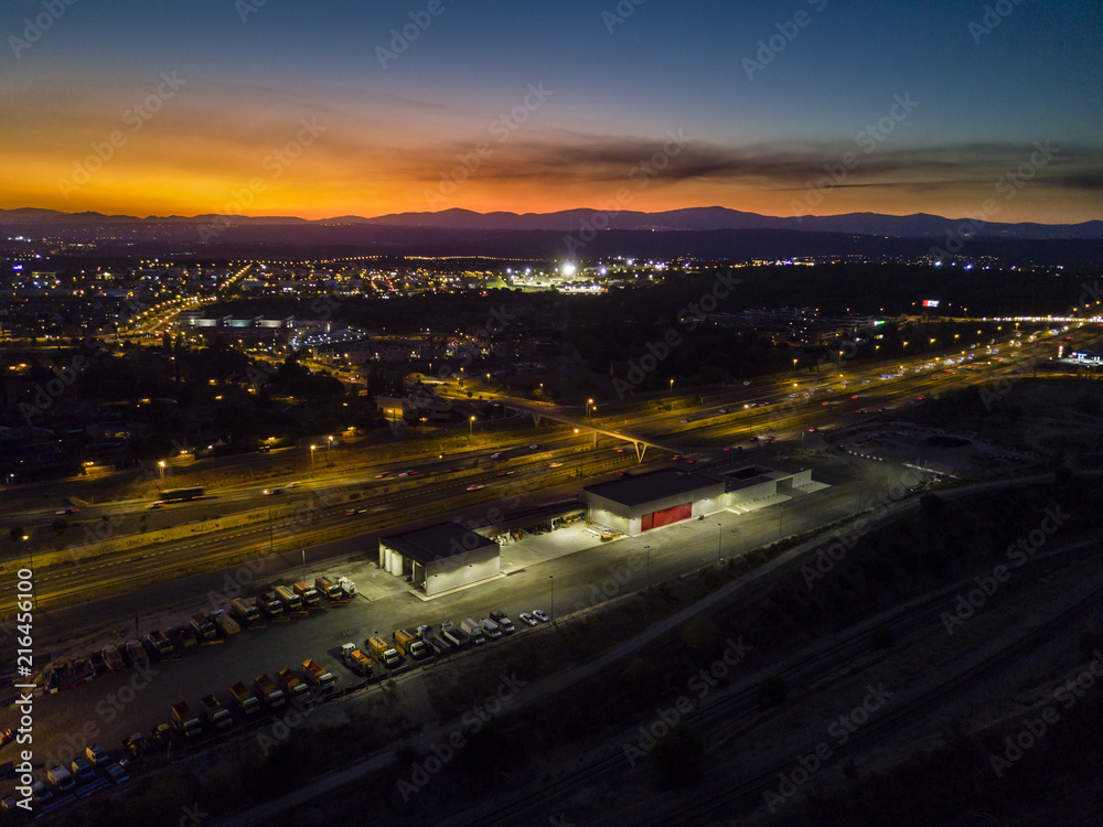 An aerial view from the drone of a neighborhood in the outskirts of Madrid city. The sunset above the mountains of Madrid with the cars passing away at the highway and the town lights start lighting