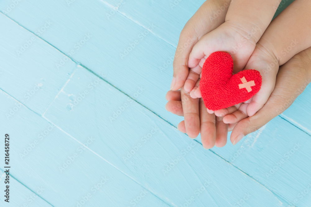 Top view of adult and child holding red heart in hands, Happy family relationships, Valentine's day, Mother's Day, Love and health care concept.