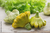 Small green bush pumpkins ( patissons) and lettuce leaves.