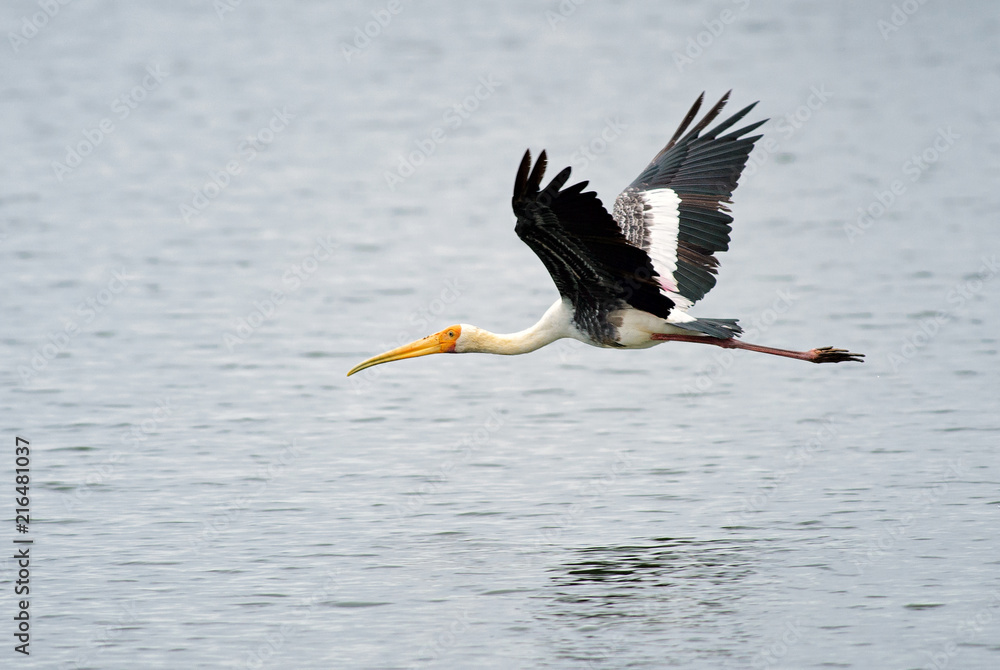 Painted Stork - Mycteria leucocephala, large colored stork with yellow beak from Sri Lanka lakes