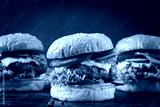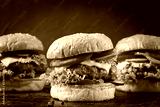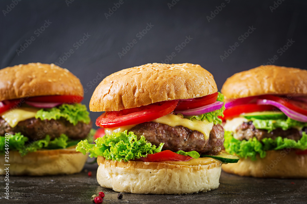 Three hamburger with beef meat burger and fresh vegetables on dark background. Tasty food.