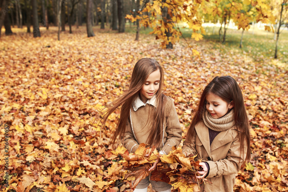 Two little sisters plays in the autumn leaves in park