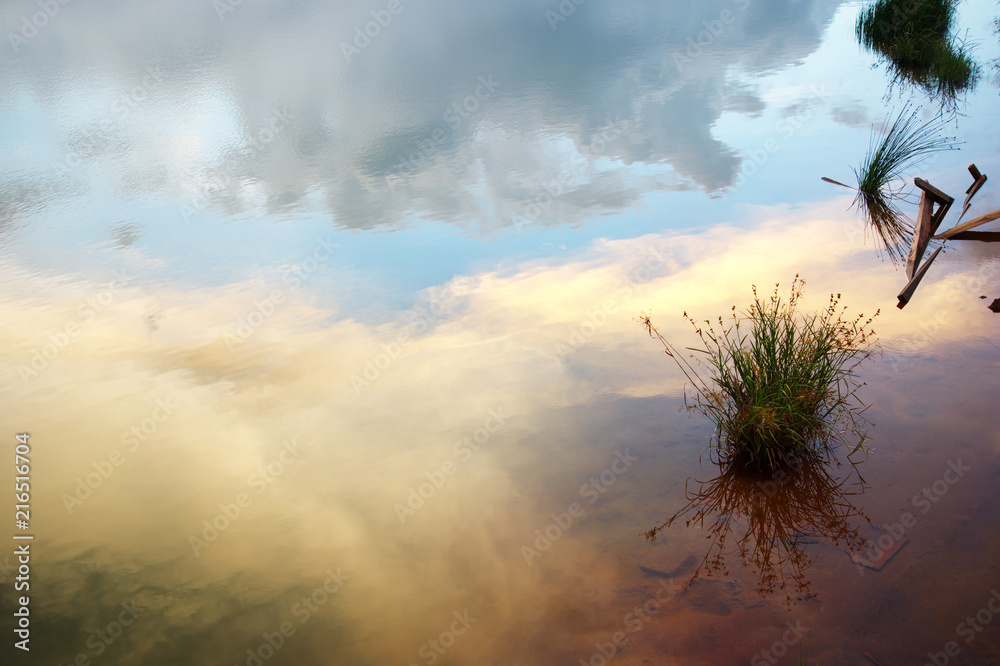 reflection sunset sky with cloud on lake summer water with meadow grass nature background