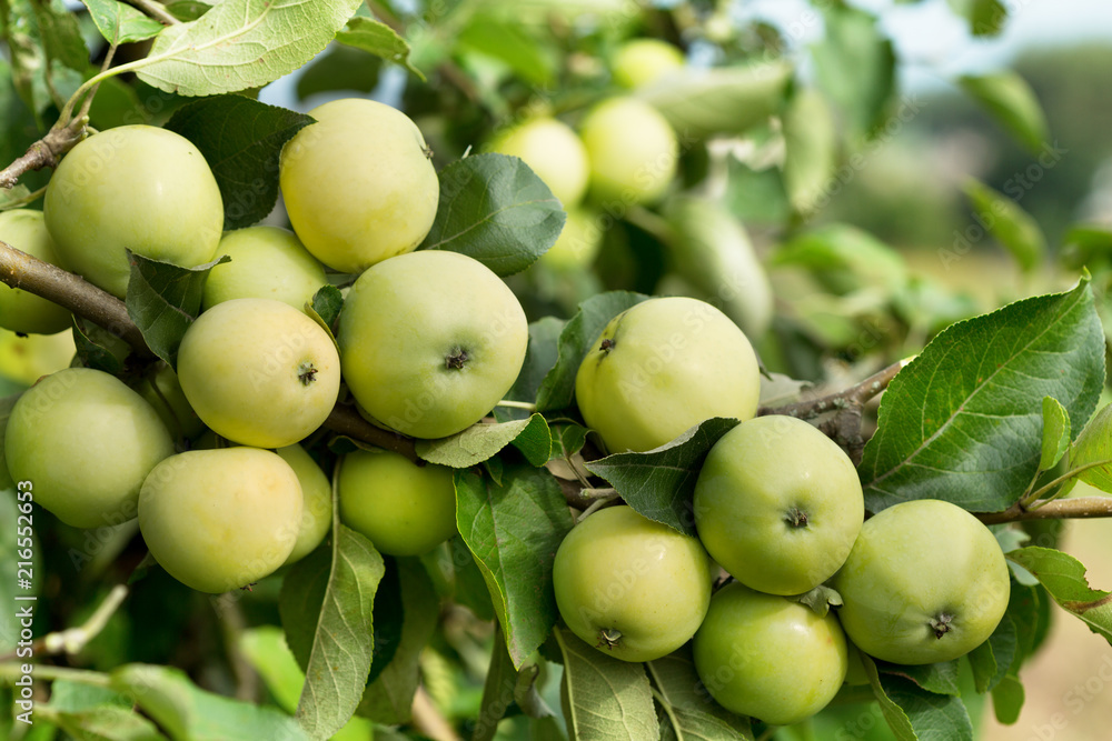 green apples on a tree in a garden