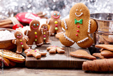 Homemade gingerbread cookies with ingredients for christmas baking