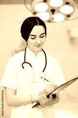 young pretty doctor girl in white medical dressing gown with stethoscope on modern clinic background