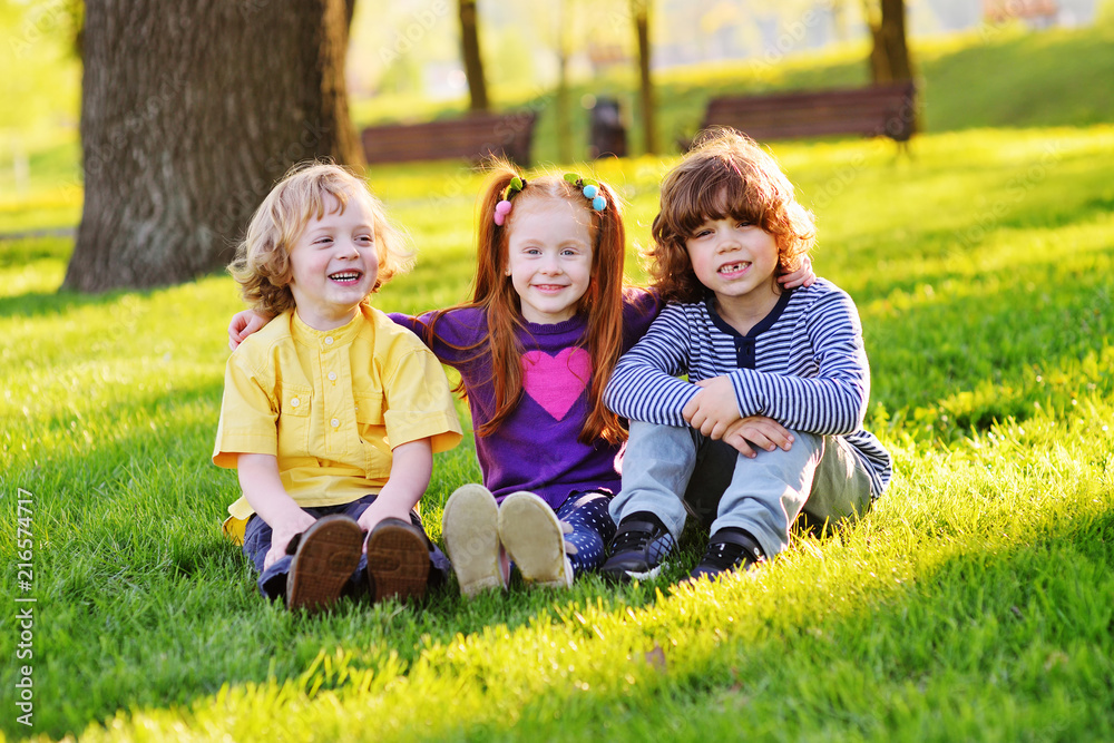 group of happy little children smiling sitting in park on grass under a tree. June 1, Children's Day, friendship, childhood, vacation.
