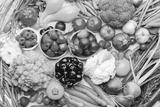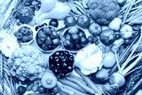 Summer fruits vegetables berries background, apples cherries peaches strawberries cabbage broccoli cauliflower squash tomatoes carrots spring onions beetroot, top view, selective focus