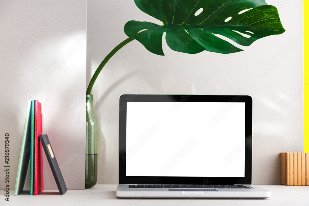 Creative home office desk in grey with a laptop mock up. Minimal workspace.