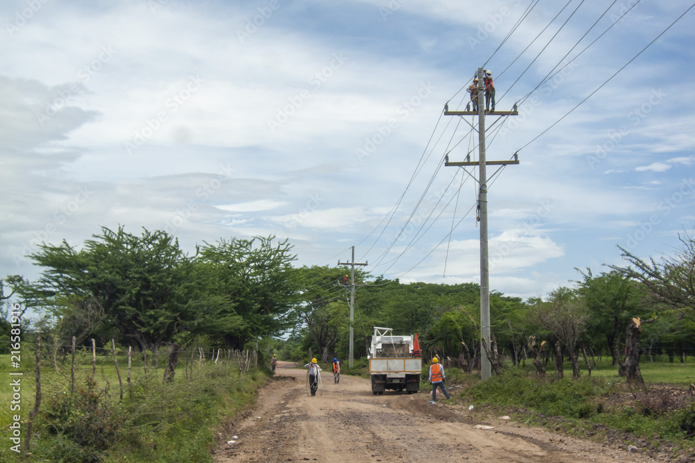 Workers working in the towers for connecting new Power Line distribution for electricity at the rural area of Honduras