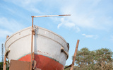 Old fishing boats on a sandy beach.