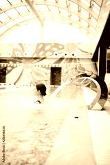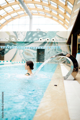 Young woman enjoying water splashes on her back while standing in spa swimming-pool