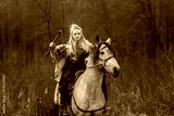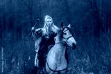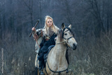 Blonde warrior viking woman riding horse with ax in hand against forest background ready to attack.