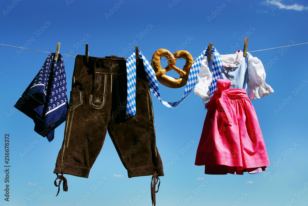 Lederhose und Dirndl hängen an Wäscheleine, Volksfest, Oktoberfest, Textraum, copy space