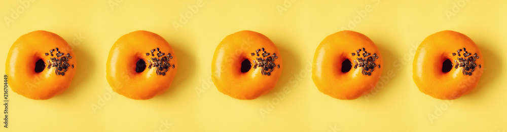 Flat lay donuts pattern on pastel orange background. Top view. Square crop. Sweet doughnut texture, copy space