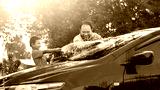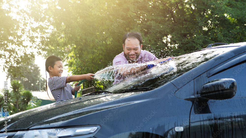 Happy Asian boy help parent washing car on water splashing with sunlight at home, Slow Motion. Activity holidays in family..