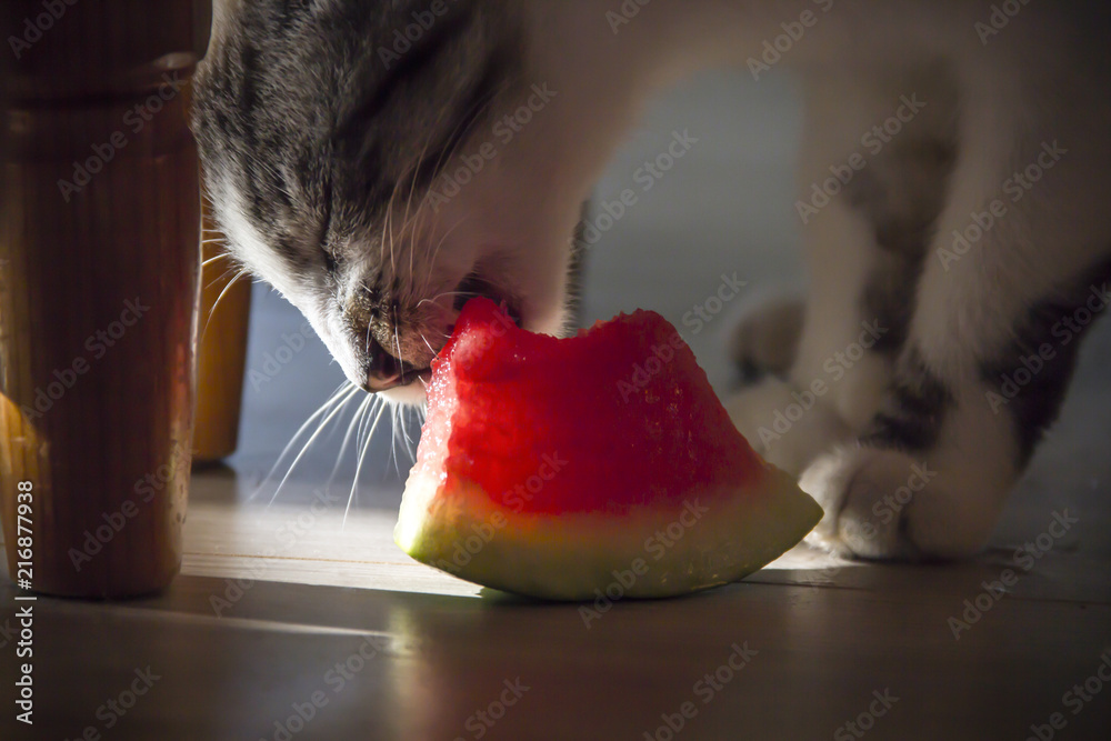 on a dark background under the table a cat is eating a watermelon in a ray of light