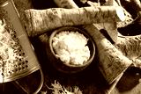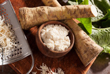 Raw horseradish roots and grated horseradish.