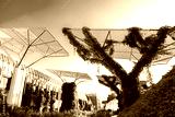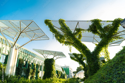 Warsaw, Poland / August 5 of 2018: View of beautiful gardens on roof of University library in center of Warsaw. Green building, plants and many trees. Good location for rest, reading book.