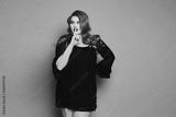 Plus size sexy model girl, fashionable blonde in black short dress, with bright makeup and with stylish hairstyle, saying hush and posing at pink background in studio