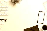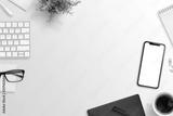 Designer desk with free space in the middle for text. Flat lay scene with smart phone, cup of coffee, keyboard, glasses, plant, notepad.