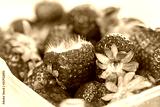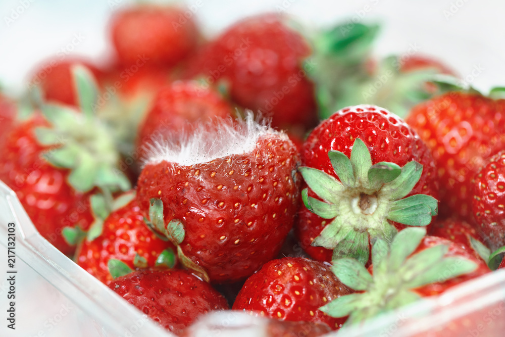 Closeup macro shot image of rotten strawberry with white large mold placed in plastic box.