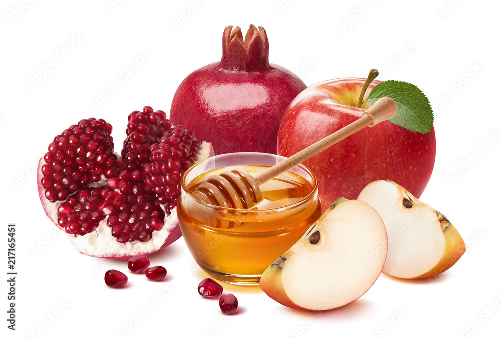 Jewish New Year composition. Pomegranate, red apple and honey