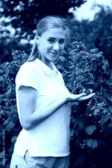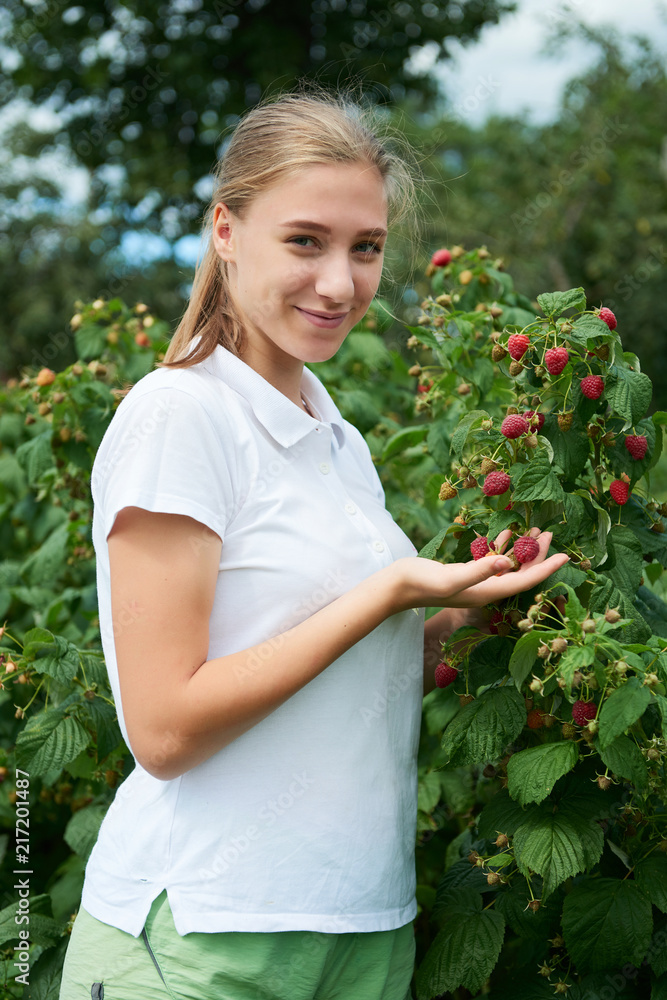 Young girl gardener in white T-shirt gather a harvest raspberry on summer day