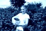 Young girl gardener in white T-shirt gather a harvest raspberry on summer day