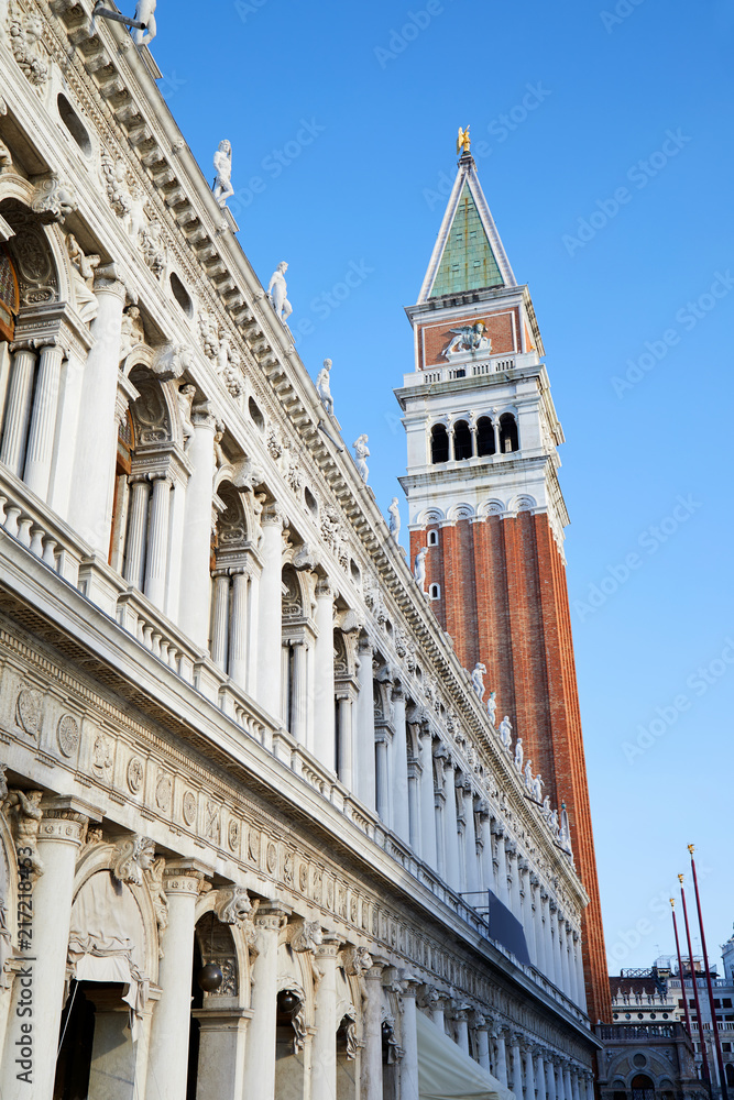 Venice, National Marciana library building and San Marco bell tower, blue sky in a sunny day in Italy