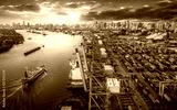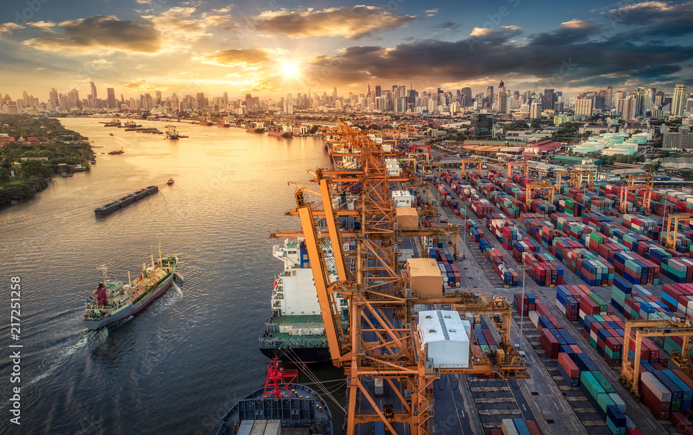 Logistics and transportation of Container Cargo ship and Cargo plane with working crane bridge in shipyard at sunrise, logistic import export and transport industry background