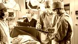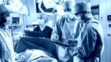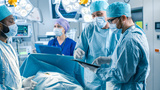 Professional Surgeons and Assistants Talk and Use Digital Tablet Computer During Surgery. They Work in the Modern Hospital Operating Room.