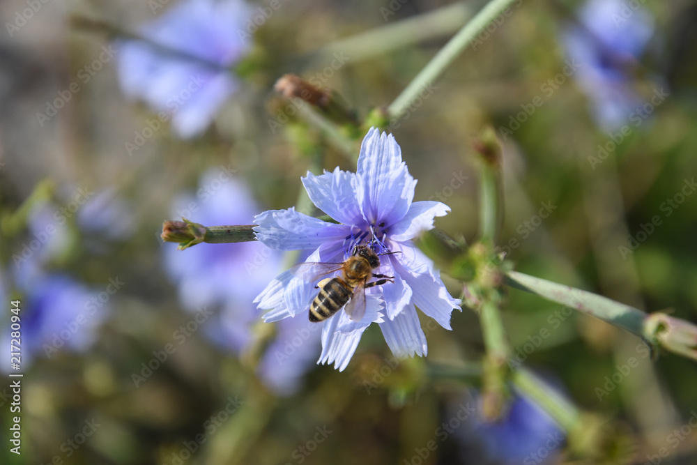 Honey bee on blue Chicory flower (Cichorium intybus), Honeybee collect nectar on healthy wild flowers