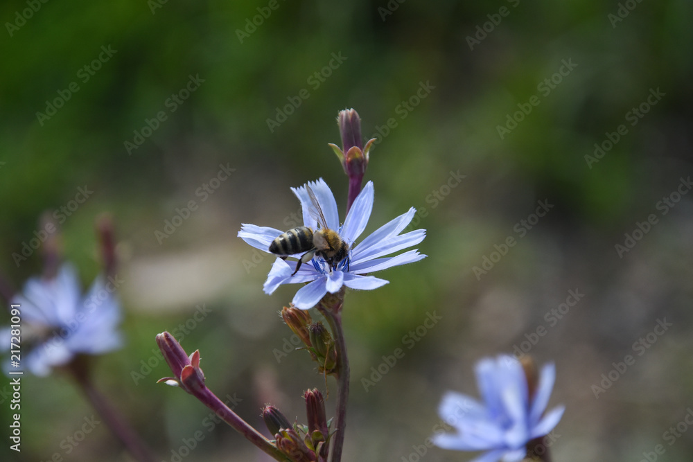 Honey bee on blue Chicory flower (Cichorium intybus), Honeybee collect nectar on healthy wild flowers
