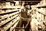 Family shopping for groceries in supermarket. Smiling african american couple with shopping trolley choosing food in supermarket